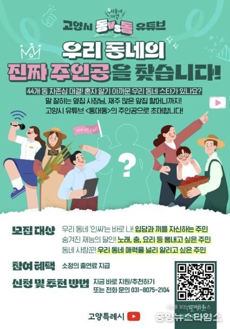 (중앙뉴스타임스 = 방재영 기자) 고양특례시가 44개 동 주민들이 직접 주인공으로 참여하는 신규 유튜브 예능 콘텐츠 ‘동대동(우리 동네 대결)’의 본격적인 제작을 앞두고 ‘우리 동네 대표 선수’를 모집한다고 9일 밝혔다.