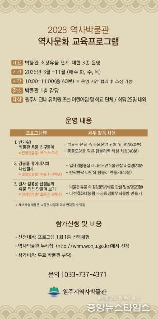 (중앙뉴스타임스 = 방재영 기자) 원주시역사박물관은 오는 3월부터 11월까지 ‘2026년 역사문화 교육프로그램’을 운영한다고 19일 밝혔다.