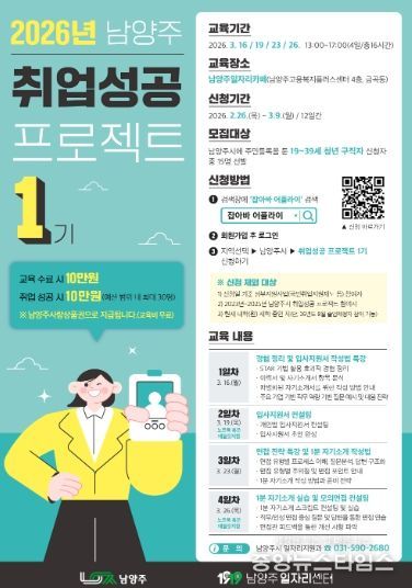 (중앙뉴스타임스 = 방재영 기자) 남양주시는 오는 26일부터 청년 구직자의 취업 경잭력 강화를 위해 ‘2026 취업성공 프로젝트 1기’참여자를 모집한다고 25일 밝혔다.
