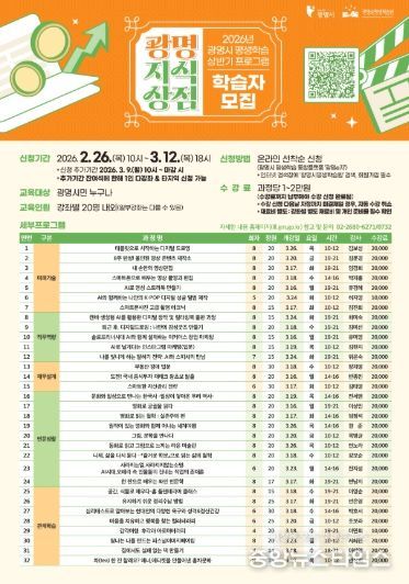 신청은 광명시민이면 누구나 가능하며, 2월 26일부터 광명시 평생학습 통합플랫폼 ‘광명이(e)지’에서 선착순으로 접수한다.