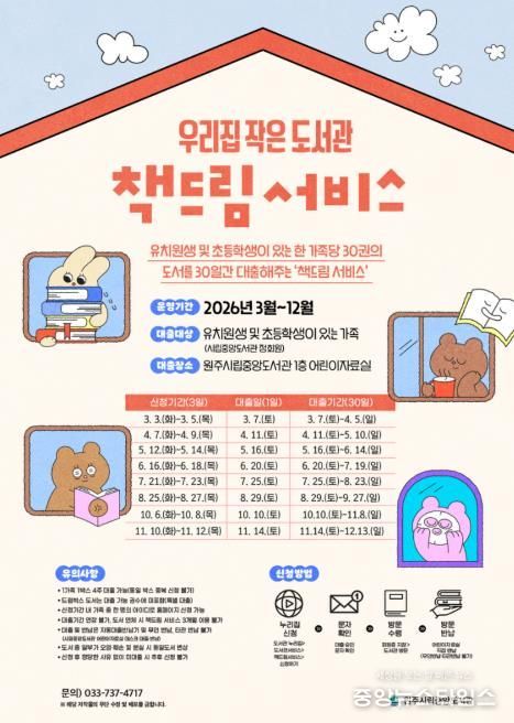 (중앙뉴스타임스 = 방재영 기자) 원주시립중앙도서관은 3월부터 우리집 작은도서관 ‘책드림 서비스’를 운영한다고 3일 밝혔다.