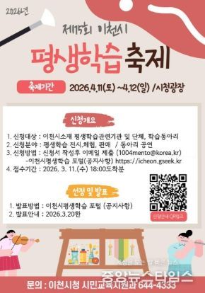 부스 및 공연 참가 신청은 3월 11일까지 접수하며, 신청서 양식은 이천시 평생학습 포털 내 소식정보(공지사항)에서 내려받을 수 있다. 심사 결과는 평생학습실무추진위원회 심사를 거쳐 3월 중 발표될 예정이다.