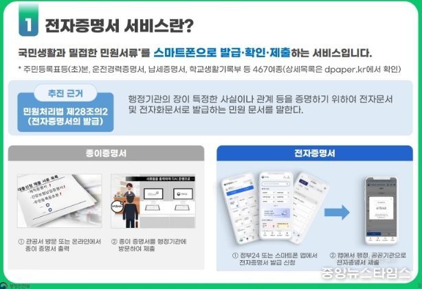 발급을 위해서는 정부24 앱 설치와 회원가입이 필요하다. 발급은 ‘△MyGOV-전자증명서 발급 △정부24-제증명서 검색-발급하기-온라인 발급(전자문서지갑)-신청하기 △발급내역 목록-증명서 선택-보내기-1회 열람 선택-보내기’로 진행하면 된다.