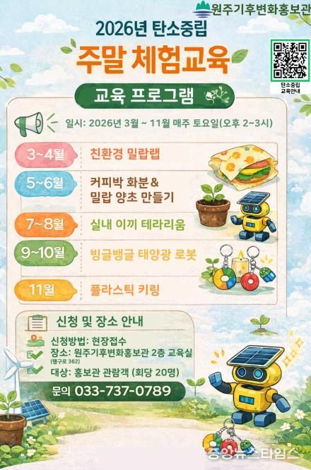 (중앙뉴스타임스 = 방재영 기자) 원주기후변화홍보관은 시민들이 생활 속에서 탄소중립을 쉽고 재미있게 이해하고 실천할 수 있도록 ‘탄소중립 주말 체험교육 프로그램’을 운영한다.