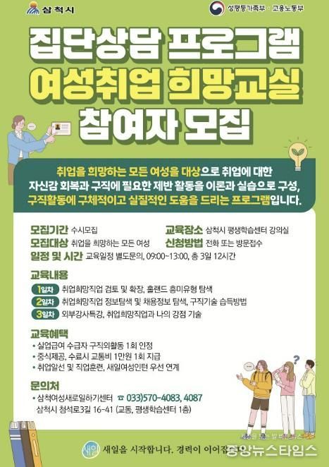 (중앙뉴스타임스 = 방재영 기자) 삼척여성새일센터는 취업을 희망하거나 준비 중인 모든 여성을 대상으로 집단상담 프로그램 ‘여성취업 희망교실’ 참여자를 연중 수시 모집한다.