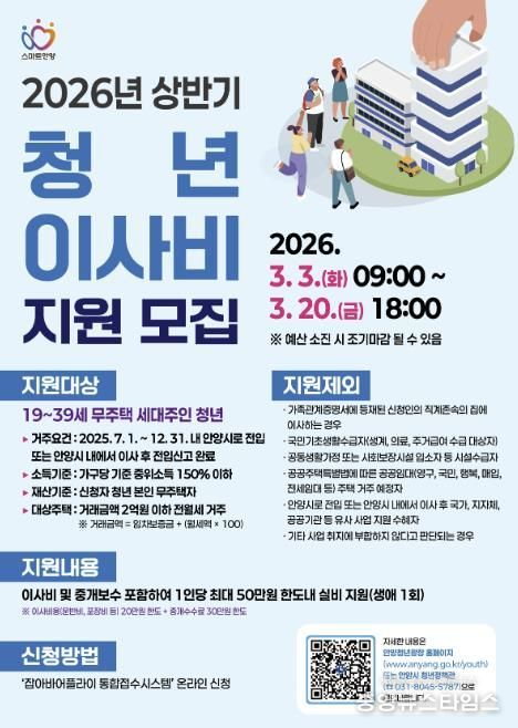 (중앙뉴스타임스 = 방재영 기자) 안양시는 청년가구의 초기 정착비용 부담 완화를 위해 이사비용을 최대 50만원까지 지원하는 ‘청년가구 이사비 지원’ 사업을 올해도 시행한다고 6일 밝혔다.