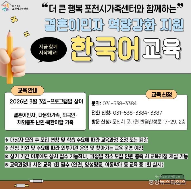 (중앙뉴스타임스 = 방재영 기자) 포천시 더 큰 행복 포천시가족센터는 2026년 결혼이민자 역량강화 지원 사업의 일환으로 한국어교육 과정을 수준별, 단계별 체계로 확대 개편하고 본격적인 운영에 들어갔다.