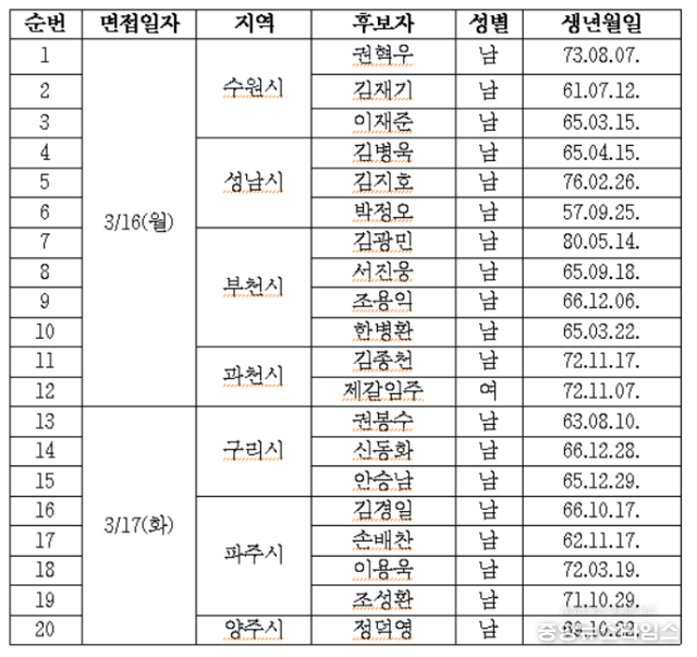 (중앙뉴스타임스 = 방재영 기자) 더불어민주당 경기도당이 2026년 제9회 전국동시지방선거를 앞두고 경기도 31개 시·군 기초단체장 후보자 공개면접을 진행한다.
