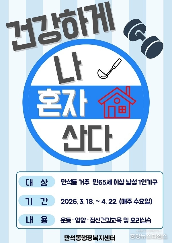 (중앙뉴스타임스 = 방재영 기자) 인천 동구 만석동 지역사회보장협의체(민간위원장 김은희)는 취약계층 65세이상 남성 1인 가구를 대상으로 맞춤형 운동·영양·정신건강 교육과 만성질환 예방 건강 요리 교실을 추진한다고 17일 밝혔다.