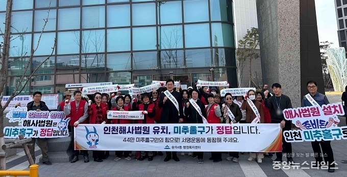(중앙뉴스타임스 = 방재영 기자) 인천 미추홀구 숭의4동 행정복지센터(동장 이주원)는 지난 23일 공무원, 지역 주민 60여 명이 참여한 가운데 ‘인천해사국제상사법원(이하 해사법원) 미추홀구 유치’를 위한 거리 홍보 캠페인을 전개했다.