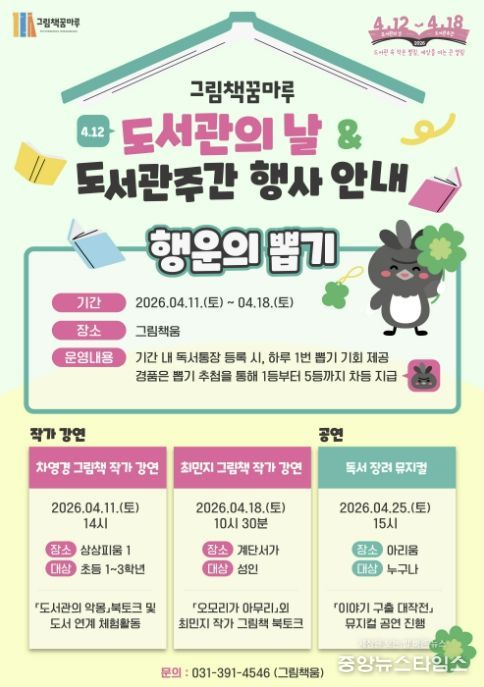 (중앙뉴스타임스 = 방재영 기자) 군포 그림책꿈마루는‘도서관의 날(4월 12일)’을 맞아 이용자 누구나 참여할 수 있는 다양한 문화 프로그램을 운영한다고 밝혔다.