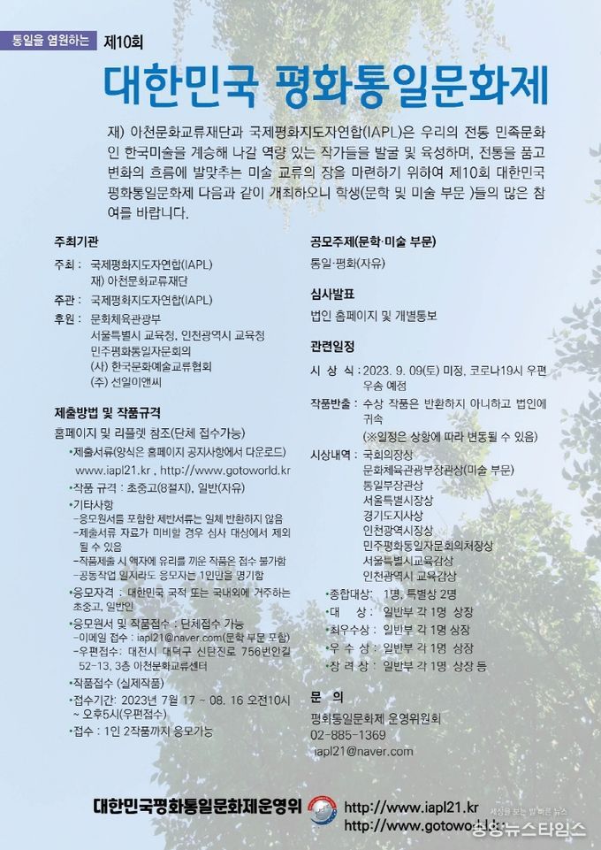 (중앙뉴스타임스 = 방재영 기자) 국제평화지도자연합(IAPL) 및 재단법인 아천문화교류재단 이사장 장연수(성민)는 이번 행사부터 아천문화교류재단의 제10회 설잠 통일문화제와 통합하여 유치원, 초중고 및 일반인을 대상으로 하는 미술 및 문학 공모전(7월 17일-8월 16일 공모기간)과 9월 9일(토) 아천문화교류센타(예정)에서 “제10회 대한민국 평화통일문화제”를 개최한다고 밝혔다.