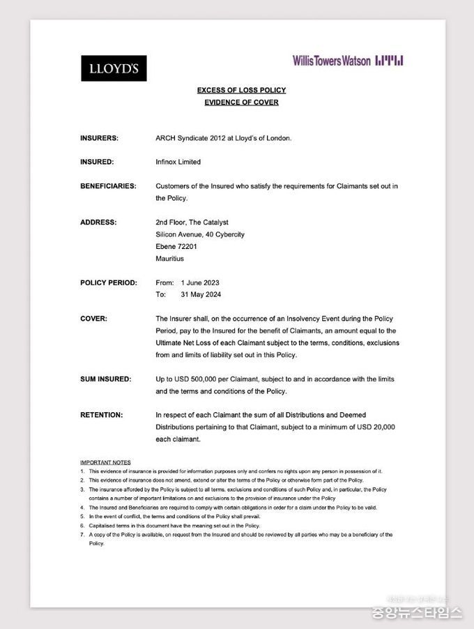 인피녹스는 세계 최대 보험 연합 LLOYDS 보증 아래, 은행 파산 등 지급 불능 사태에 이를 경우 청구인당 최대 $500,000 USD 까지 보호받을 수 있다.