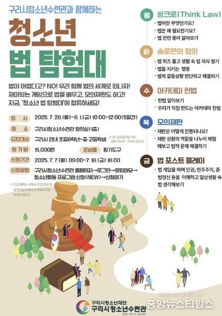 (중앙뉴스타임스 = 방재영 기자) 구리시청소년재단 청소년수련관은 여름방학을 맞아, 청소년들을 위한 특별한 법 체험 프로그램 『청소년 법 탐험대』를 운영한다고 밝혔다.