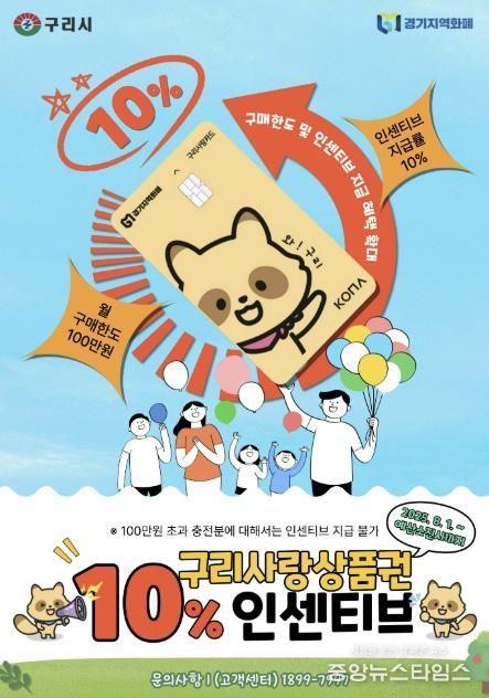 (중앙뉴스타임스 = 방재영 기자) 구리시는 8월부터 연말까지 구리사랑상품권의 인센티브율을 기존 7%에서 10%로 상향하고, 월 구매 한도도 80만 원에서 100만 원으로 확대한다고 4일 밝혔다.