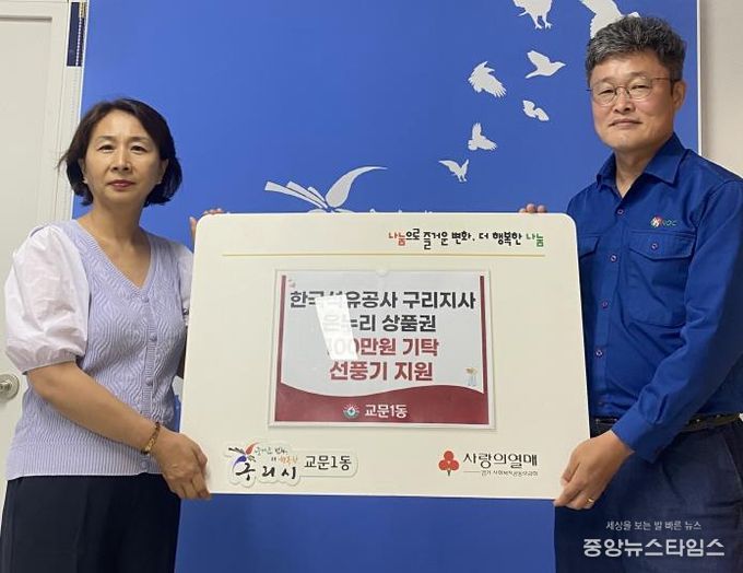 (중앙뉴스타임스 = 방재영 기자) 구리시 교문1동은 지난 7일 한국석유공사 구리지사로부터 온누리상품권 200만 원을 후원받아 지역 내 취약계층을 위한 여름철 지원사업을 추진했다고 밝혔다.