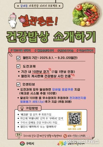 (중앙뉴스타임스 = 방재영 기자) 구리시 갈매건강생활지원센터는 갈매동 주민들의 건강한 식습관 형성과 심뇌혈관질환 예방을 위해 ‘10만보 걷고, 혈관튼튼 건강밥상 소개하기’ 비대면 챌린지를 오는 9월 1일부터 20일까지 운영한다고 밝혔다.