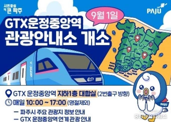 (중앙뉴스타임스 = 방재영 기자) 파주시는 9월 1일 지티엑스(GTX) 운정중앙역에 신규 관광안내소를 개소하고 본격적인 운영에 들어갔다고 밝혔다.