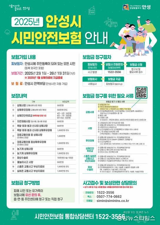 (중앙뉴스타임스 = 방재영 기자) 안성시는 예기치 못한 사고로 피해를 입은 시민들의 생활안정과 복지 향상에 기여하기 위해 ‘2025년 안성시 시민안전보험’을 지속적으로 운영하고 있다.