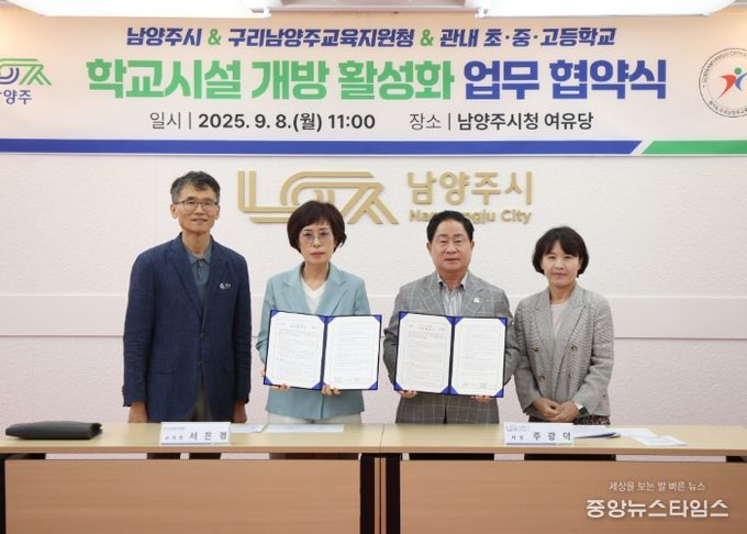 (중앙뉴스타임스 = 방재영 기자) 남양주시는 8일 시청 여유당에서 경기도구리남양주교육지원청 및 관내 초·중·고등학교와 함께 ‘학교시설 개방 활성화를 위한 업무협약’을 체결했다.