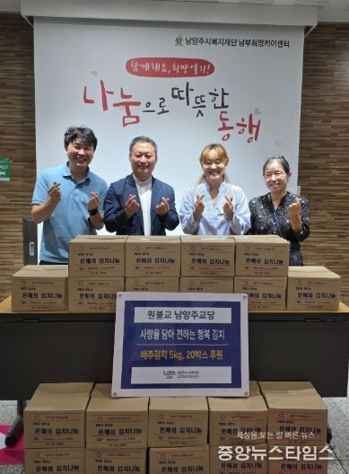 (중앙뉴스타임스 = 방재영 기자) 남양주시는 지난 17일, 원불교 남양주교당(회장 이수재)이 남부희망케어센터에 금곡동 저소득 가구를 위한 배추김치 5kg 20박스를 기부했다고 19일 밝혔다.