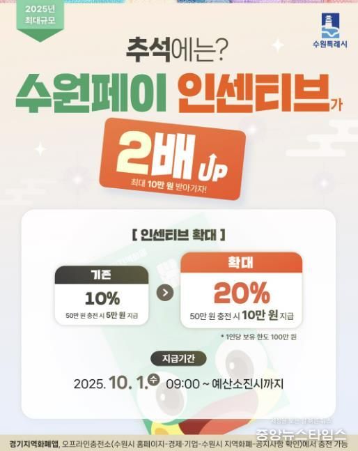 (중앙뉴스타임스 = 방재영 기자) 수원시가 추석 명절을 맞아 10월 수원페이 인센티브를 20%로 확대한다.