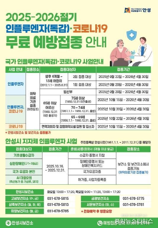 인플루엔자 및 코로나19 무료 예방접종은 별도의 예약 없이 신분증을 지참하고 지정된 위탁의료기관에서 받을 수 있으며, 관련 정보는 보건소 누리집과 예방접종도우미 누리집에서 확인할 수 있다.