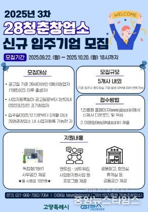 (중앙뉴스타임스 = 방재영 기자) 고양특례시가 조성하고 고양산업진흥원이 운영하는 ‘28청춘창업소’가 10월 20일까지 3차 신규 입주기업을 모집한다.