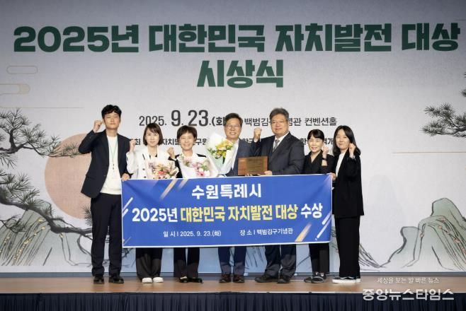 (중앙뉴스타임스 = 방재영 기자) 수원특례시가 (사)한국자치발전연구원 주관 ‘2025년 대한민국 자치발전대상’에서 기초자치 부문 대상을 받았다. 시상식은 23일 백범김구기념관 컨벤션홀에서 열렸다.