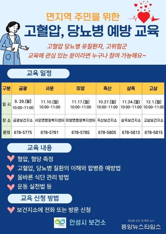 지소별 교육 일정은 금광(9.29.), 서운(11.10.), 미양(11.17.), 죽산(10.27.), 삼죽(11.24.), 고삼(12.1.) 순으로 진행되며, 참여를 희망하는 주민은 해당 보건지소에 전화 또는 방문하여 신청하면 된다.
