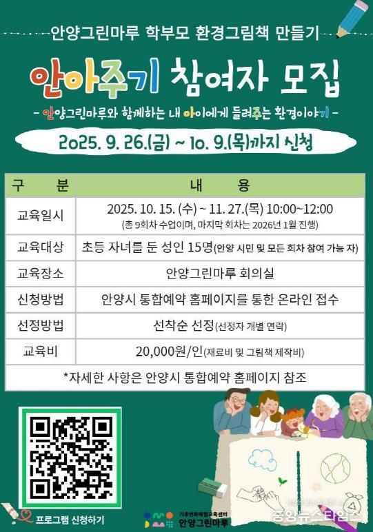 (중앙뉴스타임스 = 방재영 기자) 안양시가 기후변화체험교육센터 안양그린마루에서 오는 10월부터 11월까지 8회에 걸쳐 학부모를 대상으로 한 교육프로그램 ‘안아주기(안양그린마루와 함께하는 내 아이에게 들려주는 환경이야기)’를 운영한다고 29일 밝혔다.