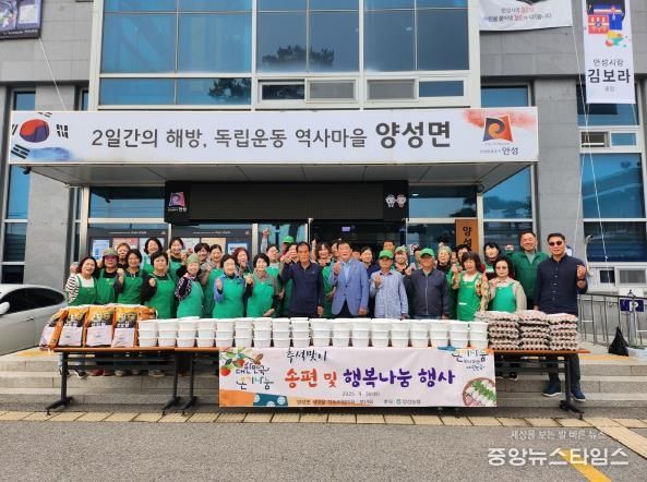 (중앙뉴스타임스 = 방재영 기자) 안성시 양성면새마을지도자․부녀회는 지난 30일 양성면 행정복지센터 앞 주차장에서 “추석맞이 송편 행복 나눔” 행사를 진행했다.