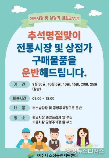 (중앙뉴스타임스 = 방재영 기자) 여주시는 여주시소상공인지원센터 주관으로 다가오는 추석 명절을 맞이하여 전통시장과 상점가를 찾는 시민들의 편의를 돕고 전통시장 활성화를 위해 ‘전통시장 및 상점가 배송 도우미’ 서비스를 운영한다.