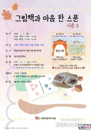 (중앙뉴스타임스 = 이광운 기자) 고양특례시 화정어린이도서관은 오는 11월 8일 ‘고소하고 향긋한 보늬밤 보틀케이크’를 만들어보는 그림책 동화요리 프로그램‘그림책과 마음 한 스푼-시즌2’를 운영한다.