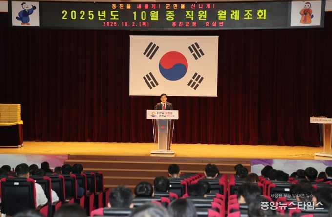 (중앙뉴스타임스 = 방재영 기자) 옹진군은 2일 군청 효심관에서 전 직원들이 참석한 가운데 ‘10월 중 월례조회’를 개최하고, 2026년 본예산 편성과 연말 사업 마무리, 가을철 재난 대비 및 추석 연휴 대응 방안 등을 공유했다.