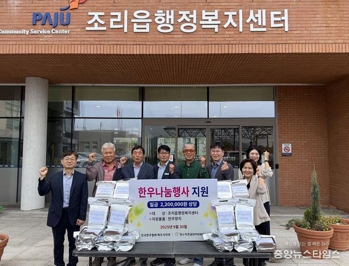 (중앙뉴스타임스 = 방재영 기자) 파주시 조리읍은 지난 9월 30일 전국한우협회 파주시지부로부터 추석 명절을 맞아 220만 원 상당의 한우 양지 43kg을 기탁 받았다고 전했다.