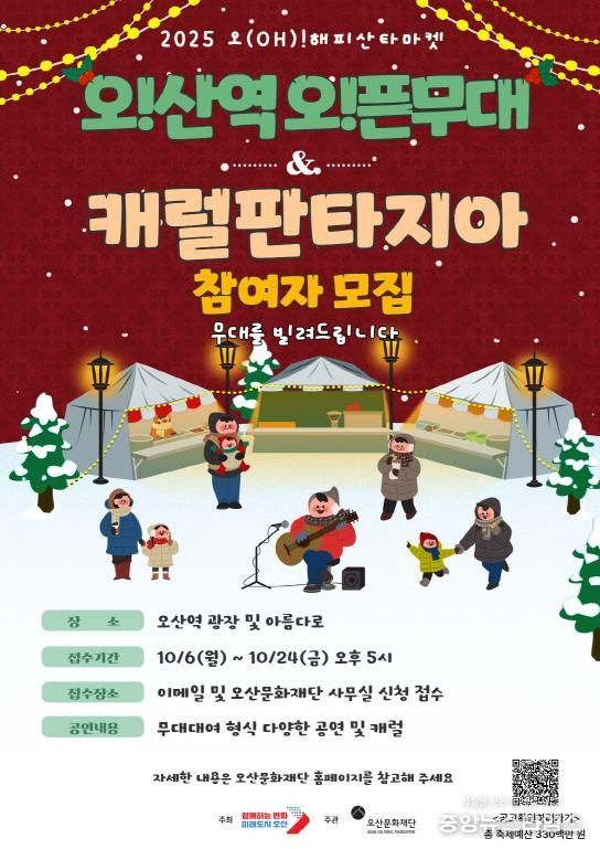 (중앙뉴스타임스 = 방재영 기자) (재)오산문화재단은 겨울 대표 축제인 ‘2025 오(oh)! 해피산타마켓’을 맞아 특별 프로그램 ‘오!산역 오!픈무대’와 ‘캐럴 판타지아’의 참가자를 모집한다고 10일 밝혔다.
