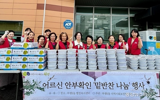 (중앙뉴스타임스 = 방재영 기자) 인천 부평구 부평6동 지역사회보장협의체는 지난 2일 저소득 홀몸 어르신 60가구에 돼지불고기·겉절이 등 직접 조리한 밑반찬 3종과 과일을 전달하는 ‘어르신 안부확인’ 사업을 진행했다.