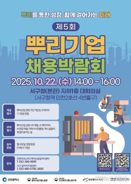 (중앙뉴스타임스 = 방재영 기자) 인천테크노파크(인천TP)는 뿌리산업 인력난 해소와 지역 고용 활성화를 위해 10월 22일 14시에 인천 서구청(본청) 대강당에서 ‘제5회 뿌리기업 채용박람회’를 개최한다.