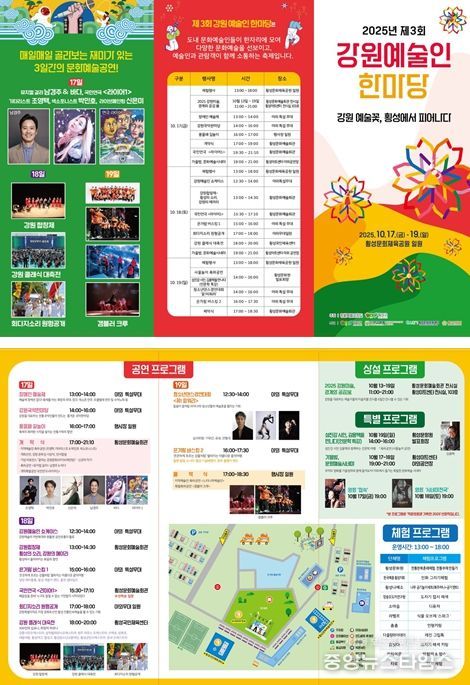 (중앙뉴스타임스 = 방재영 기자) 강원예술인과 도민의 화합·소통·공감을 위한 '2025 제3회 강원예술인 한마당' 행사가 오는 17일부터 19일까지 3일간 횡성문화체육공원 일원에서 열린다.