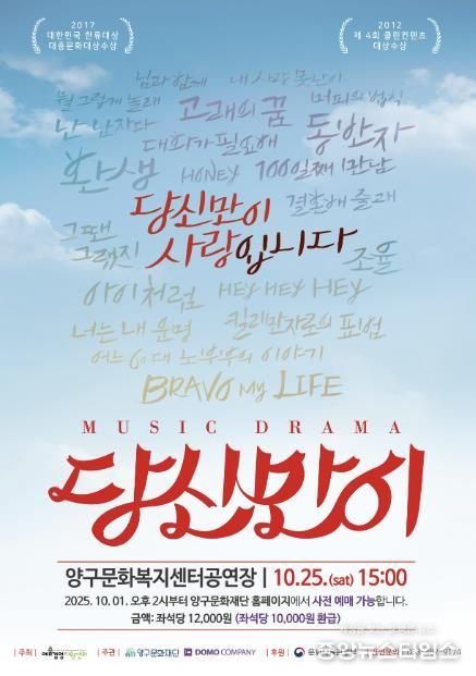 (중앙뉴스타임스 = 방재영 기자) 양구문화재단은 깊어가는 가을, 가족 모두가 함께 즐길 수 있는 뮤지컬 ‘당신만이’를 오는 25일 오후 3시, 양구문화복지센터 공연장에서 선보인다.