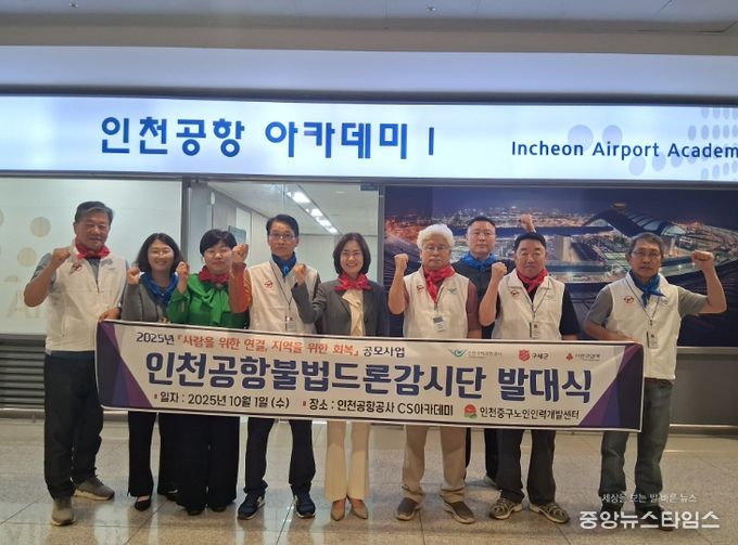 ‘인천공항불법드론감시단’은 센터가 인천국제공항공사와 구세군이 주관하는 ‘2025 건강한 인천공동체 만들기 공모사업’에 선정돼 사업비를 지원받아 운영하는 노인 일자리 사업으로, 중구 지역 어르신 5명으로 구성됐다.