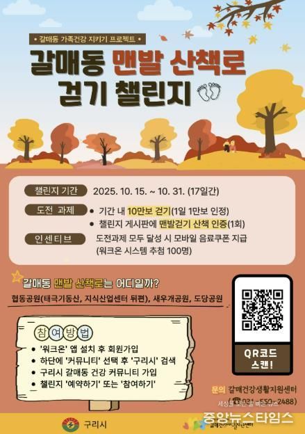 (중앙뉴스타임스 = 방재영 기자) 구리시는 가을철 주민들의 건강한 생활 습관 형성과 스트레스 완화를 위해 ‘갈매동 맨발 산책로 걷기 챌린지’를 오는 10월 15일부터 31일까지 17일간 운영한다고 밝혔다.