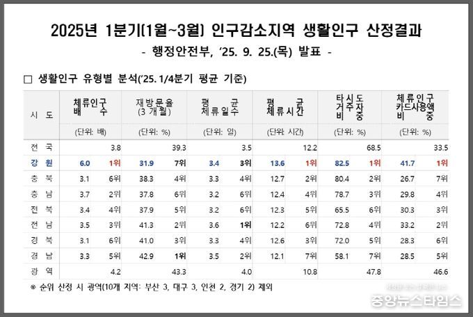 (중앙뉴스타임스 = 방재영 기자) 강원특별자치도는 행정안전부가 9월 25일 발표한 ‘2025년 1분기 인구감소지역 생활인구 산정 결과’에서 체류인구 총 2,826,012명으로 전국 최고 수준을 기록했다고 밝혔다.