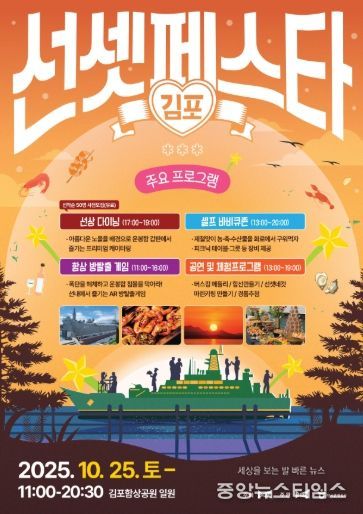 (중앙뉴스타임스 = 이광운 기자) 아름다운 석양을 배경으로 선상 다이닝을 즐길 수 있는 특별한 축제가 김포에서 열린다. 오는 25일 단 하루, 토요일 오전 11시부터 밤 8시 30분까지 대곶면 김포함상공원 일원에서 ‘2025 김포 선셋 페스타 위드(with) 로컬푸드 다이닝’이 개최된다.