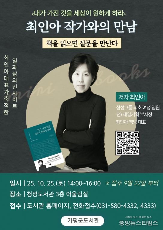 (중앙뉴스타임스 = 김수진 기자) 가평군은 이달 25일 오후 2시 청평도서관에서 ‘2025년 정기 작가와의 만남’ 강연을 개최한다. 이번 강연은 ‘최인아 책방’ 대표로 잘 알려진 최인아 작가를 초청해 ‘책을 읽으면 질문을 만난다’를 주제로 열린다.