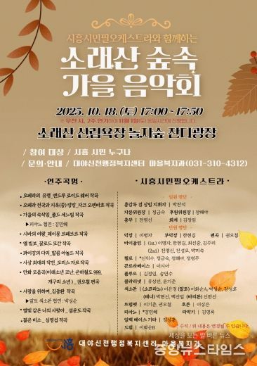 (중앙뉴스타임스 = 이광운 기자) 시흥시 대야·신천행정복지센터는 오는 18일 소래산 삼림욕장 놀자숲 잔디광장에서 대야·신천동 지역 주민을 위한 ‘소래산 숲속 가을 음악회’를 개최한다.