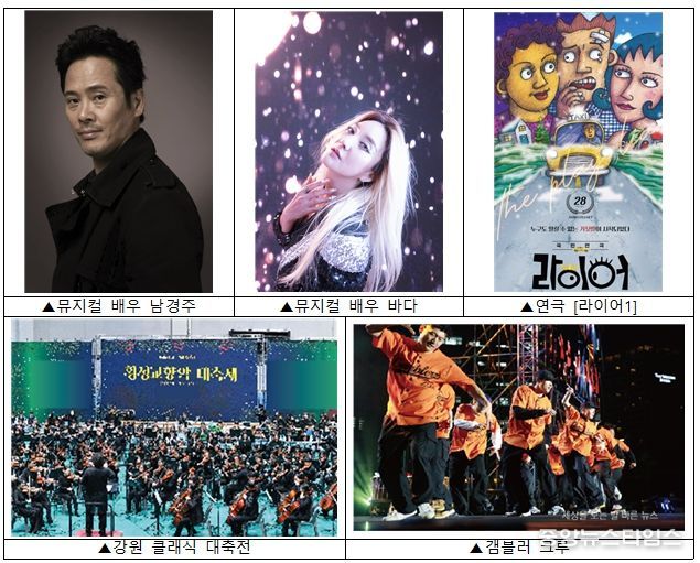 또한 “꽃피는 강원문화”를 주제로 하는 라이브페인팅 퍼포먼스, 그리고 뮤지컬배우 남경주 · 바다의 축하공연과 국민연극 [라이어1]를 만나볼 수 있다.