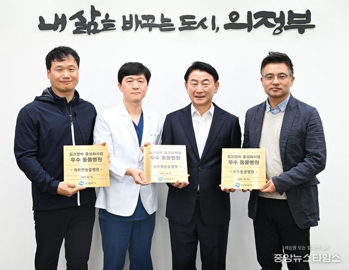 (중앙뉴스타임스 = 방재영 기자) 의정부시는 10월 15일 시장실에서 ‘길고양이 중성화사업 우수 동물병원’ 인증패 전달식을 열고, 사업에 적극 참여해 지역 동물복지 문화 확산에 기여한 동물병원을 격려했다.