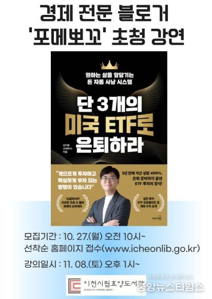 (중앙뉴스타임스 = 이광운 기자) 이천시 효양도서관은 시민들의 경제적 이해력 향상과 현명한 자산 관리 능력 제고를 위해 오는 11월 8일 오후 1시, '단 3개의 미국 ETF로 은퇴하라'의 저자이자 네이버 경제 전문 블로거 김지훈(필명 포메뽀꼬)을 초청해 재테크 특강을 진행한다.